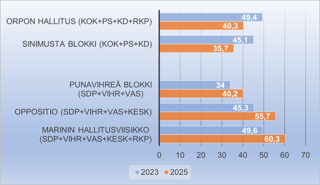 Orpon hallitus ei alunperinkään ollut kovin suosittu, mutta (epä)onnekas vaalimatematiikka sekä RKP:n lähtö Orpon ja Purran matkaan mahdollisti hallituksen muodostamisen. Hallituspuolueiden kannatus 2023 eduskuntavaaleissa oli vain 49,4%, siis niukasti alle puolet äänestäneistä.